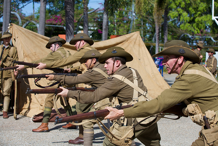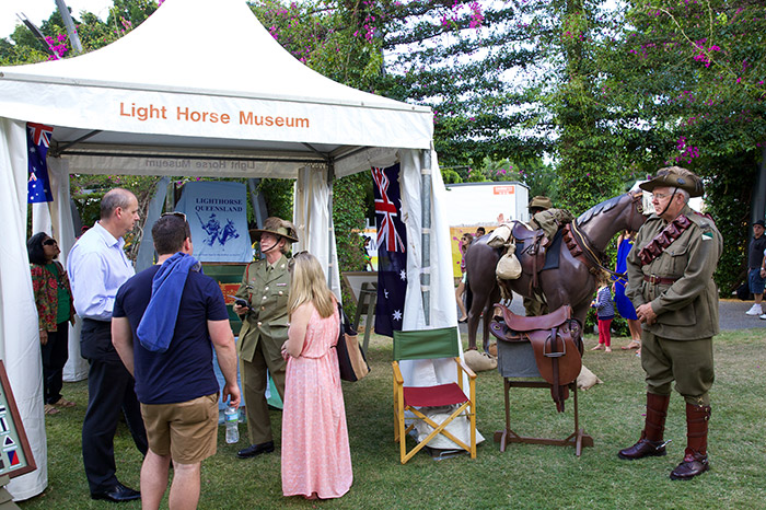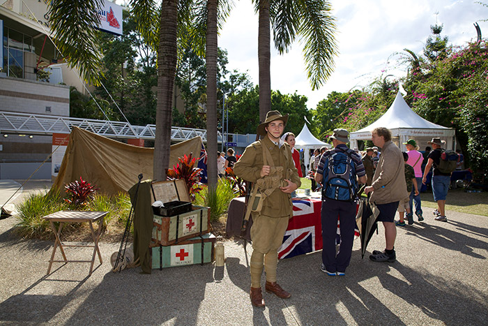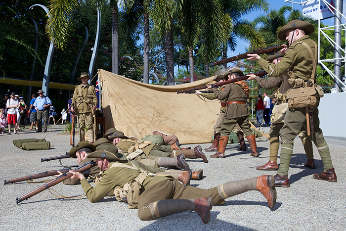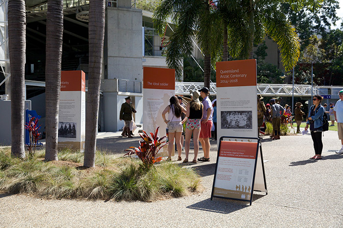 On Saturday 27 September 2014 visitors to South Bank Parklands had the unique opportunity to see what life was like as a soldier in the First World War. The event—which coincided with Sunsuper Riverfire—was a pop-up exhibition staged outside The Courier-Mail Piazza. The exhibition brought together educational displays, artefacts from the Australian Light Horse Association and 9th Battalions Association and live performances of solider training exercises as undertaken in 1914.