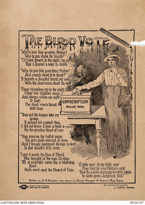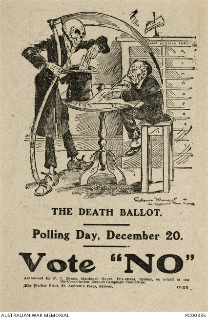 On 7 November 1917, Prime Minister Hughes announced he would again put the question of conscription to the Australian public. While he had the majority in both houses of parliament and could enact the necessary legislation without a referendum, Hughes wanted to give the Australian public the chance to “right the wrongs” of the 1916 outcome.