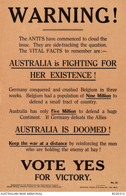 - Throughout the debate, most Australians believed that the First World War was a just cause. Opinions generally only differed on whether men should be forced to enlist.
