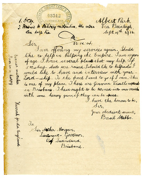 Basil Stubbs was only 15 years old when the First World War began in 1914. He came from a family of 14 children, and was determined to follow his older brother and join the war effort. Although he was too young to serve his country, Basil wrote to the Lieutenant-Governor of Queensland on two occasions to offer his services and battle strategies.
