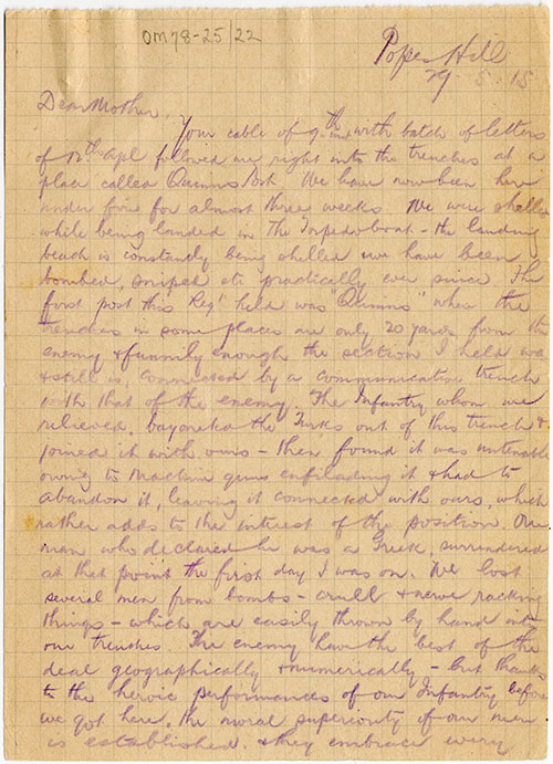 Written in May 1915, George Herbert Bourne's letter to his mother speaks about his time in the trenches at Quinn's Post and the morale of the Australian soldiers.
