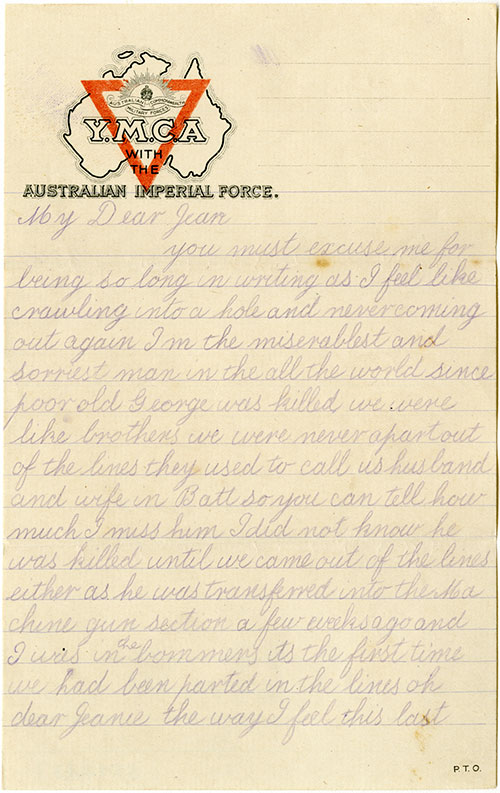 While serving on the frontlines, Owen formed a strong friendship with George Samuel Deviney, a young farmer from the Lockyer Valley. Sadly, George died in battle on 5 April 1918; this had a profound effect on Owen.