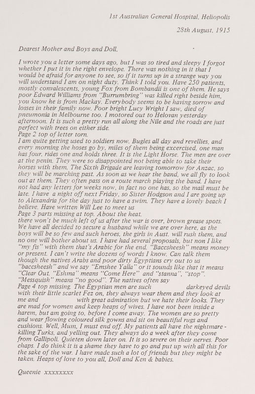 Edith Florence Avenell was known by her nickname, ‘Queenie’. In her letter, she writes home to her family about her experiences as a nurse based in Heliopolis.