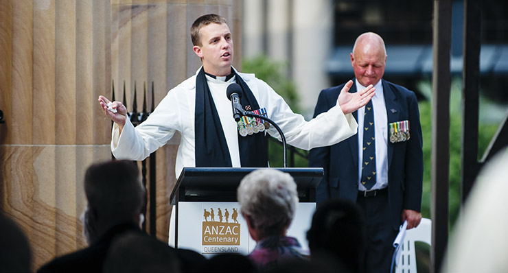Words written from the bloodied, muddy trenches of the Western Front were read aloud by a humbled son to a hushed and teary crowd gathered at the Shrine of Remembrance at Brisbane’s Anzac Square.